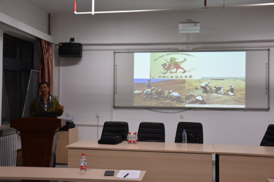 吕君昌研究员围绕“戈壁滩寻找恐龙”这一主题详细介绍了在蒙古国西南戈壁寻找恐龙化石的野外考察经历及科学发现,并与参会师生进行了深入的探讨和交流。