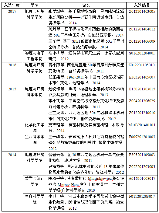 近日,中国科学技术信息研究所公布了2017年度“领跑者5000——中国精品科技期刊顶尖学术论文(F5000)”,并下发了2016年度入选证书。2017年度,我校有4篇论文入选,分别是必赢766net手机版张学斌等发表在《自然资源学报》的《基于景观格局的干旱内陆河流域生态风险分析——以石羊河流域为例》、周丹等发表在《自然资源学报》的《基于标准化降水蒸散指数的陕西省近50a干旱特征分析》、王东等发表在《自然资源学报》的《基于SPEI的西南地区近53 a干旱时空特征分析》以及物理与电子工程学院马永杰等发表在《计算机应用研究》的《遗传算法研究进展》。2016年度,我校有2篇论文入选,分别为必赢766net手机版任正果等发表在《地理学报》上的《1961-2011年中国南方地区极端降水事件变化》和黄小燕等发表在《自然资源学报》的《西北地区近50年日照时数和风速变化特征》。