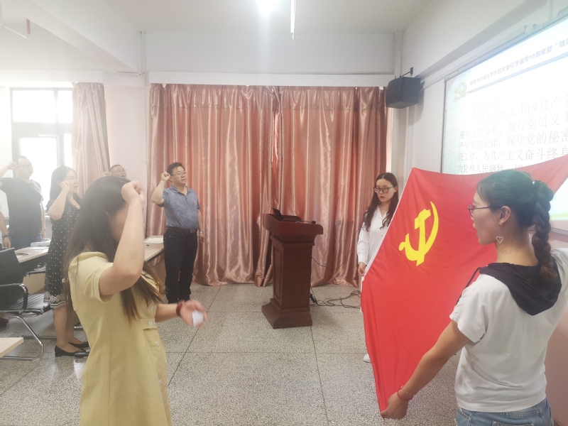 在全体党员齐唱《国际歌》之后,学院各党支部书记为预备党员佩戴了党徽,预备党员面向党旗庄严宣誓,与会的其他党员也再次重温了入党誓词;宣誓结束后预备党员代表分享了入党感言,他们郑重表示,要继续学习党章、学习党规、学习习近平总书记系列讲话精神,牢记入党誓词,践行入党誓词,履行党员义务,努力做一个合格的共产党员。