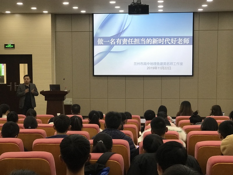 2019年11月22日,应必赢766net手机版邀请,金城名师、兰州市“领军人才”、兰州市外国语高级中学高级教师鱼建英老师为我院“本硕一体生”及地理科学专业本科生做题为《做一名有责任担当的新时代好老师》的交流报告;会议由学院“本硕一体化”负责人胡梦珺副教授主持,学院“本硕一体化”导师、2019级多专业“本硕一体生”、地理科学专业本科生约180人参加。