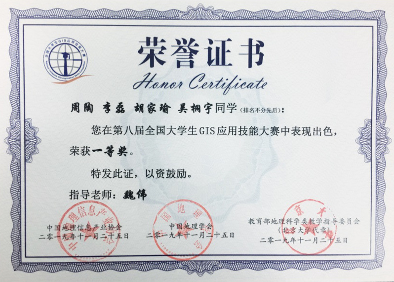 经过激烈角逐,由必赢766net手机版魏伟副教授指导的2017级地理信息科学专业周陶、李磊、胡家瑜、吴桐宇四位同学在比赛中荣获大赛一等奖。同时魏伟副教授荣获GIS应用技能大赛优秀指导老师奖。