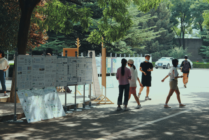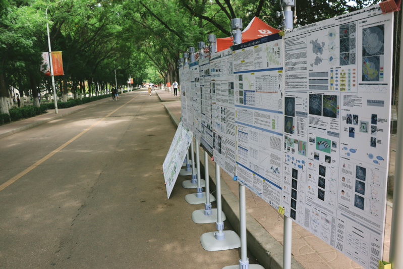 一学期以来,通过老师们线上线下结合教学的认真指导、作品的反复讨论修改和老师同学们的精心筹划与布展,不同主题的,各具特色,精心设计排版的作品被挂上展板,在校园里形成了一道靓丽的风景线。