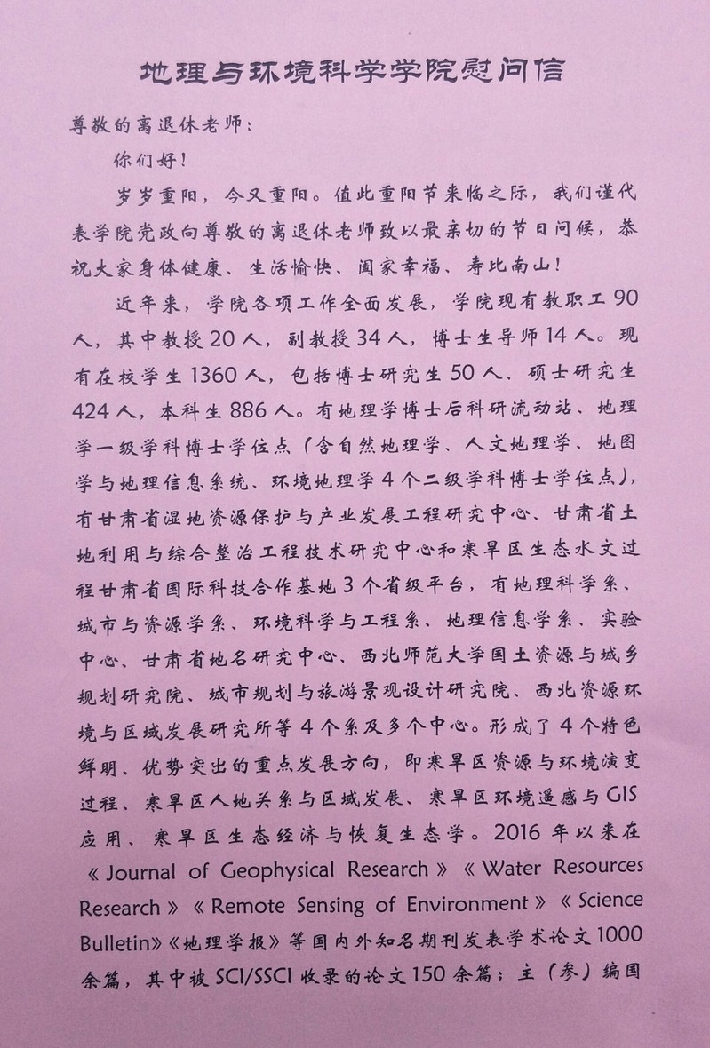 九九重阳节,浓浓敬老情。为表达学院对离退休老教师的关怀,10月26日,必赢766net手机版于国建书记、马利邦院长、王招祥副书记等院领导对离退休老教师进行走访慰问,为离退休老教师送去慰问信、慰问品和全体师生美好的节日祝福。