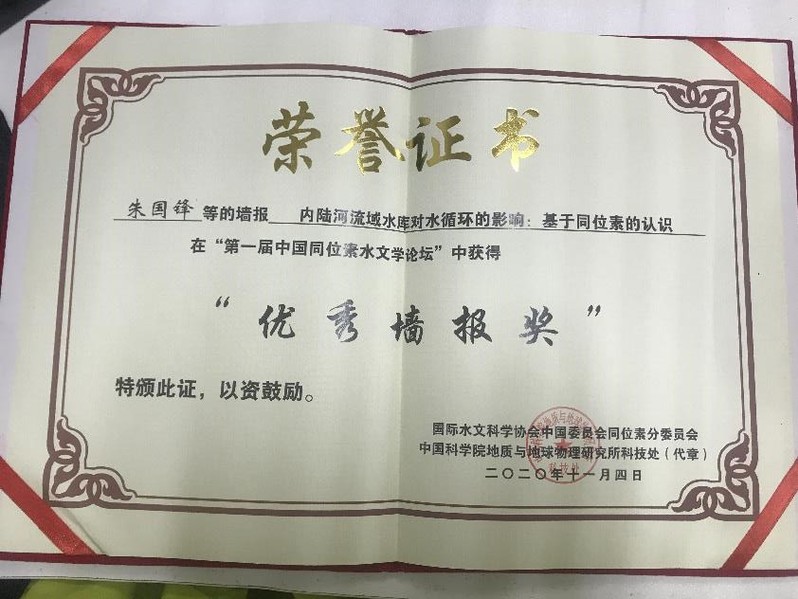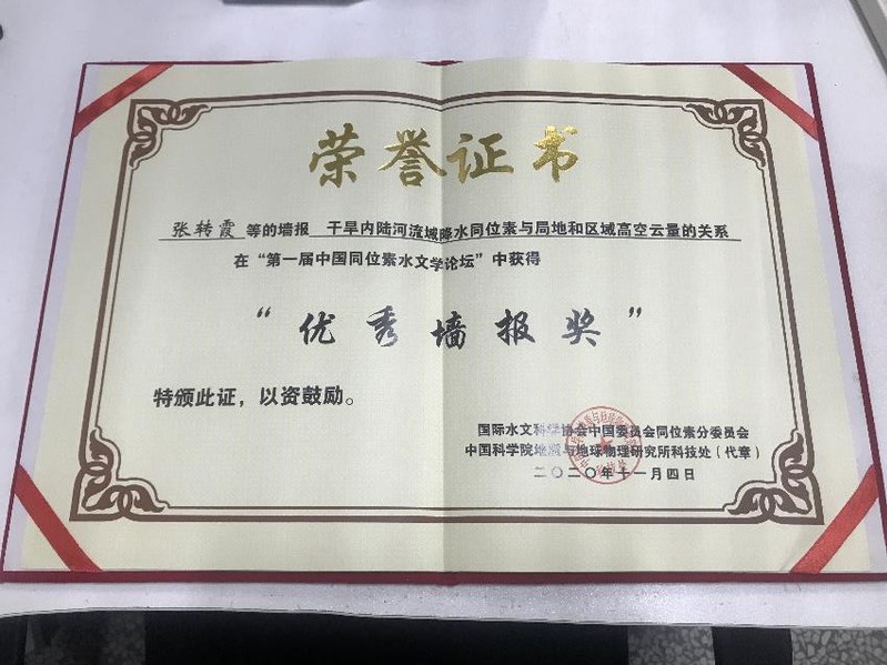 学院张明军教授、王圣杰副教授及研究生参加了此次会议。张明军教授参与主持了4日上午的会议报告。王圣杰副教授做了题为《新疆降水与水汽氢氧稳定同位素监测研究》的会议报告,介绍了近年来在干旱区同位素水文学方面的研究进展。朱国锋副教授等的墙报《内陆河流域水库对水循环的影响:基于同位素的认识》和研究生张转霞等的墙报《干旱内陆河流域降水同位素与局地和区域高空云量的关系》获得优秀墙报奖。