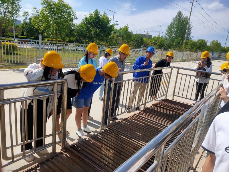 随后,在工程师的带领下学生们戴好安全帽进入园区污水处理区域,工程师详细向学生们讲解了压泥的操作顺序,包括进料、压榨、角吹、反吹以及松开,同时还开放了试剂与动力车间,使学生们对整个污水处理过程有了更深刻的理解和学习。