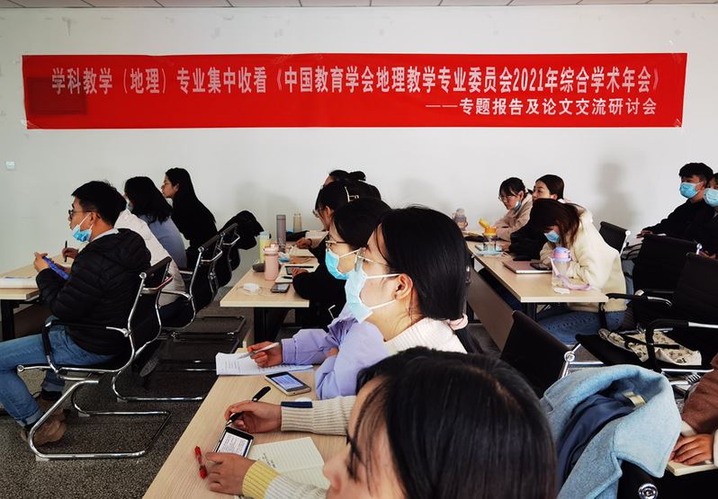 中国教育学会地理教学专业委员会2021年综合学术年会于2021年11月29-12月1日以“主会场+分会场”“线上”会议模式隆重召开,本次会议主题为“探索新方法 融合新技术 推进基础教育地理课程改革”。地理科学系组织全体”本硕一体生”及部分地理科学师范生于11月29日13:30-18:00在综合实验楼A810、A815集体观看了本次年会的高师地理学术研讨。