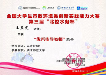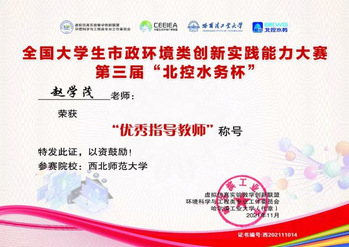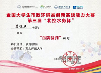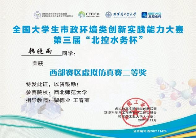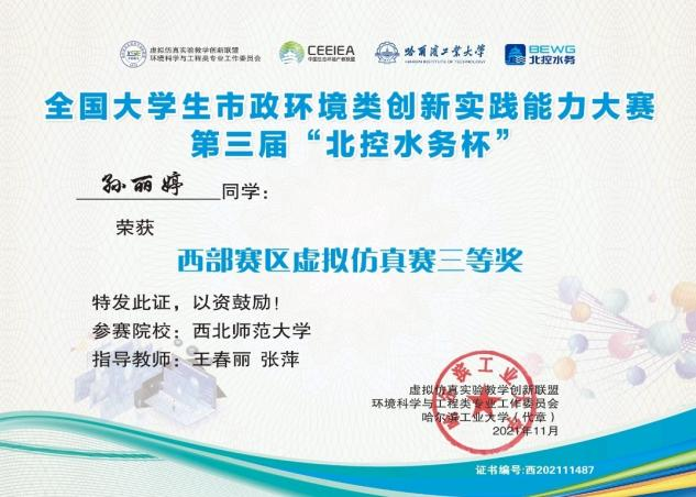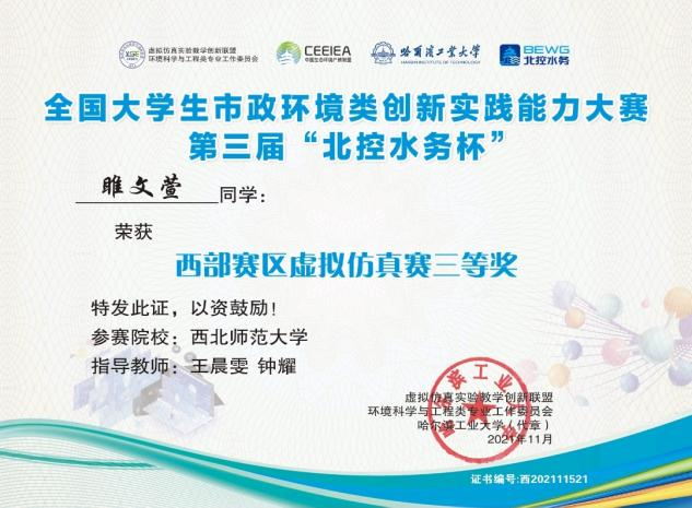 近日,必赢766net手机版环境科学与工程系师生参加了由虚拟仿真实验教学创新联盟环境科学与工程类专业工作委员会、生态环境产教联盟、哈尔滨工业大学、同济大学、南开大学、兰州大学、北控水务集团和北京欧倍尔软件技术开发有限公司共同举办的2021年全国大学生市政环境类创新实践大赛(在线),2019级环境工程(卓越班)刘佳娇、2020级环境工程(卓越班)刘洁和韩晓雨同学获得西部赛区虚拟仿真赛二等奖,2019级环境工程(卓越班)孙丽婷、2020级环境工程(卓越班)康凯和睢文萱获得西部赛区虚拟仿真赛三等奖。张萍、赵学茂、王春丽、钟耀、瞿德业和王晨雯老师被评选为“优秀指导教师”,瞿德业老师获得“金牌裁判”的荣誉称号。