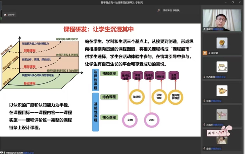 李树民教授从落实立德树人的根本任务出发,结合无锡市市北高级中学校本课程资源开发与建设,对融合地理课程资源开发的立场(基准点)、课程资源开发的关键点、成果凝练核心载体和推广应用等四个方面剖析了高中地理融合课程资源开发的步骤、方法及需注意的主要问题,强调高中地理课程资源开发要选对主题、抓住时机、校内校外资源全方位联合;并以市北高级中学的环境灾害厅为例,展示了层级联动的教研模式和面向减灾教育的设计型学习模式。