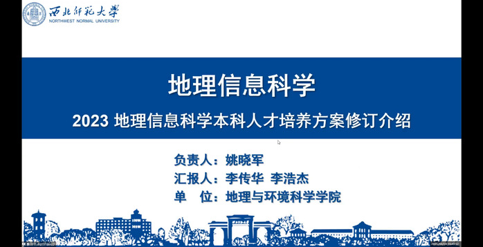 为贯彻落实人才培养新任务新要求,适应教学改革发展需要,有效提升本科人才培养质量,2023年4月4日地理信息学系组织召开了地理信息科学专业人才培养方案专家论证会。会议采用线上方式进行,兰州大学颉耀文教授、南京师范大学南卓铜教授和兰州交通大学王世杰教授对人才培养方案进行了审议,地理信息学系李传华副教授、张彦丽副教授、魏伟教授及部分年轻教师参加会议,会议由姚晓军副院长主持。